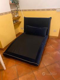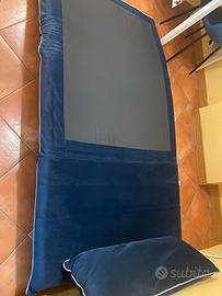 Divano letto Maison du Monde in velluto blu con cuscino. Dimensioni da chiuso 104 x74x84h (nella parte dello schienale), aperto è un letto da una piazza e mezzo di dimensioni 107x193cm.