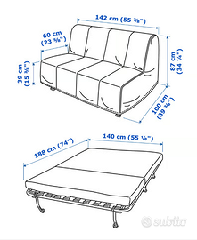 Divano letto matrimoniale IKEA LYCKSELE – ottime condizioni Vendo divano letto matrimoniale, completo di struttura, rete a doghe e materasso, come da foto. Caratteristiche •Modello: IKEA LYCKSELE •Tipologia: divano letto matrimoniale •Dimensioni divano chiuso: circa 142 cm (L) × 90 cm (P) •Dimensioni letto aperto: circa 140 × 188 cm •Struttura robusta in metallo •Rete a doghe in legno, comoda e resistente •Meccanismo di apertura semplice e veloce •Rivestimento colore grigio chiaro Materasso •Materasso IKEA per divano letto LYCKSELE •In ottime condizioni generali •Sempre utilizzato con protezione Condizioni Il divano letto è usato ma tenuto molto bene, senza difetti strutturali. Meccanismo di apertura perfettamente funzionante. Prezzo:💶 170 Ritiro:📍 Ritiro a mano (zona Centocelle) Trasporto a carico dell’acquirente. 📩 Contattami per maggiori informazioni.