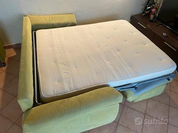 Vendo divano letto matrimoniale usato ma in buone condizioni, compreso di due cuscini notte inseriti all’interno dello schienale e il materasso matrimoniale.