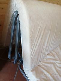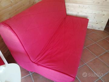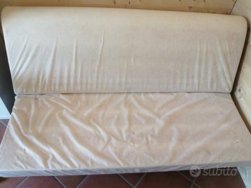 Divano letto matrimoniale. Con un semplice gesto si apre e si chiude, materasso in gommapiuma, fodera rossa, doghe in legno.