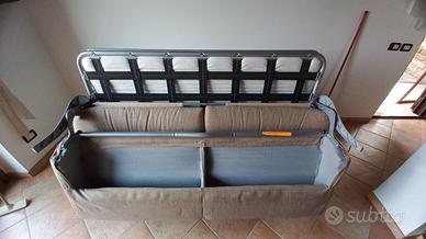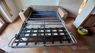 Divano letto matrimoniale in tessuto di colore beige poco usato e ben tenuto, largo 2 mt. e profondo 0,95. La rete letto è lunga 2 metri e larga 1,45.