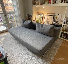 Pratico divano letto a due posti, con struttura metallica e doghe in legno.