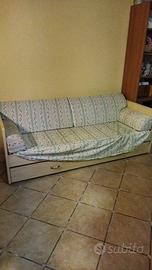 Vendo come da foto divano letto in ottime condizioni, struttura in legno, molto resistente. La seduta del divano è da considerarsi anche letto ad una piazza, mentre la parte inferiore si estrae diventando un ulteriore letto a piazza singola e messi uno accanto all’altro diventa 1 piazza ½. Non sono inclusi materassi.