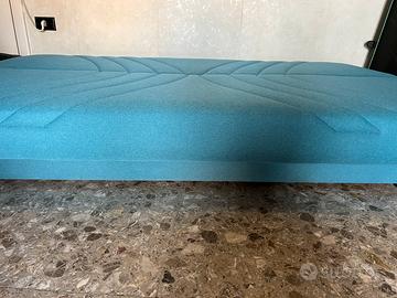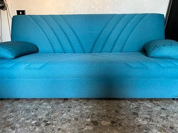 Vendo divano letto 3 posti, con cuscini annessi. Letto contenitore salvaspazio di color turchese,