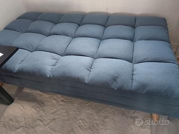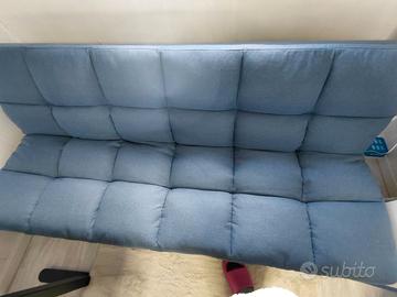 Vendo divano letto blu acquistato solo un anno fa e tenuto sempre con il copridivano, quindi il colore è perfetto e il tessuto non è per nulla sbiadito. Lo vendo solo perché vivo in una casetta piccola in campeggio e mi occupa troppo spazio, anche se il divano non è grosso. Ha cinque robuste gambe in legno e lo schienale si può regolare in diverse posizioni, come si vede bene dalle foto dove è mostrato sia in orizzontale che nelle altre modalità. Come misure il letto è 190 x 105 cm ed è esteticamente molto carino.