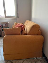 Divano letto 2 posti in cotone damascato color giallo ocra. Molto comodo ed elegante. Dotato di 4 cuscini nella stessa stoffa. Il rivestimento è interamente sfoderabile.