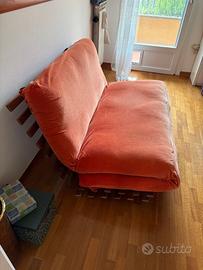 divano letto con doghe perfettamente conservato. il divano letto si apre completamente stile fouton, l'imbottitura è ricoperta da un sacco di ciniglia arancione facilmente sfoderabile grazie ai bottoni che lo chiudono.