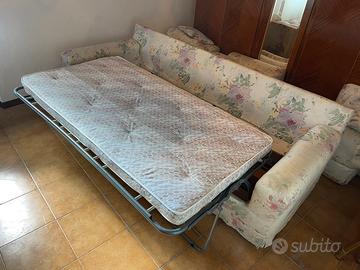 Divano letto usato, 3 posti lunghezza 230 cm. -profondità 95 cm., ampie sedute, tenuto benissimo, sfoderabile e lavabile. Completo di materasso, fondo grigio perla con fiori stilizzati come fa foto. Fattura artigianale. Prezzo onesto, ritiro a carico acquirente.
