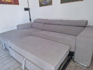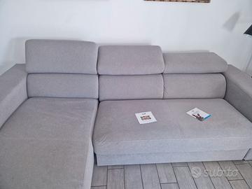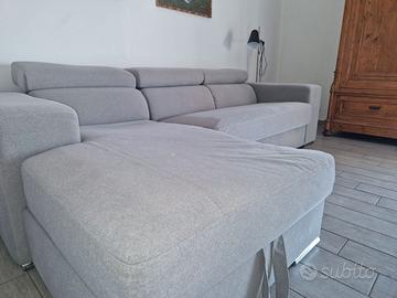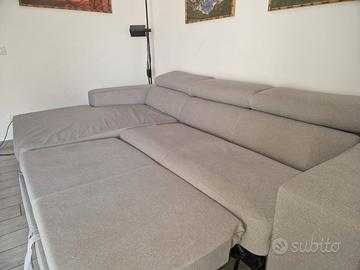 Divano con penisola contenitore, tascone laterale, poggia-piedi estraibile e poggia-testa regolabili. Il divano è rivestito in tessuto Aquaclean, di alta qualita'. Utilizzato poco e sempre protetto da copridivano o teli.