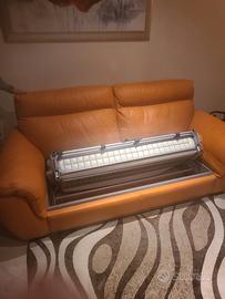 vendo bellissimo divano letto colore arancione in pelle due posti dimensioni m.2,10 di lunghezza (letto mai utilizzato materasso ancora incelofanato) più poltrona con sistema recline manuale veramente molto belli, causa cambio arredamento. Per info Enzo