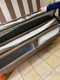 In ottime condizioni, tessuto sfoderabile e lavabile, si trasforma in un ottimo letto matrimoniale con un comodo materasso, all’interno vi sono due scomparti nei quali riporre i guanciali,