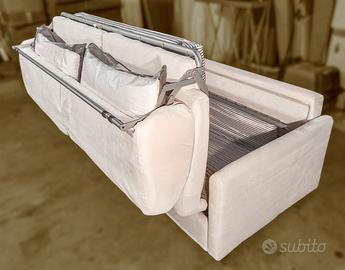 Il divano è trasformabile in letto matrimoniale tramite un meccanismo robusto e facile da aprire, con cuscini che rimangono saldamente attaccati alla struttura durante l’apertura.