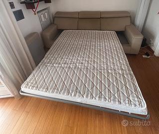 Divano letto come nuovo di PoltroneSofa senza macchie completamente sfoderabile in tessuto del 2018 colore beije/corda con penisola a poltroncina staccabile e pouf a contenitore. Dimensioni: lunghezza 250cm profondità 95cm. Pouf contenitore: 80x60cm poltroncina lato a L: 95x70cm
