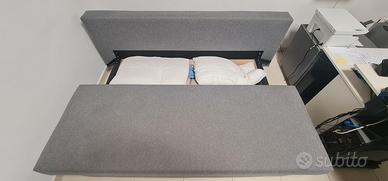 Divano letto modulare in tessuto grigio. Cassettone per biancheria da letto e cuscini.