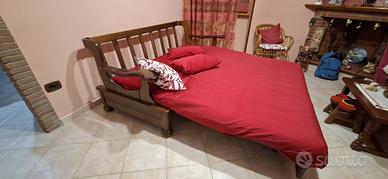 Divano letto matrimoniale con struttura in legno compreso di materasso, copripiumino, 2 cuscini e un copridivano rosso.