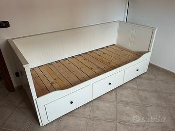 Vendo struttura letto IKEA modello HEMNES, colore bianco laccato. Soluzione versatile e salvaspazio, perfetta per camere degli ospiti o stanze dei ragazzi. • Funzionalità: Divano di giorno, letto singolo o letto matrimoniale di notte (basta estrarre la base). • Contenitore: Include 3 ampi cassetti molto capienti per lenzuola, coperte o giochi. • Condizioni: Struttura solida e ben tenuta. • Nota: I materassi non sono compresi (richiede due materassi da 80x200 cm)