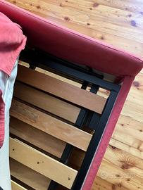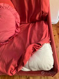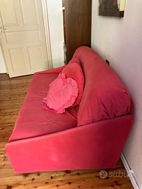 Vendesi divano letto matrimoniale rivestito in tessuto di cotone colore fucsia sfoderabile, completo di rete a doghe in legno, materasso in gommapiuma con rivestimento tipo trapunta utilizzabile come coperta in versione letto, due cuscini.