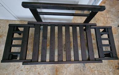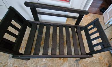 Divano letto giapponese in legno che si trasforma, grazie ai braccioli laterali obliqui, in letto singolo o chaise longue.