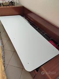 Vendo divano letto,con struttura in legno,sono due posti letto singoli ,uno a vista e l' altro a scomparsa nel cassettone sotto il divano(io l' ho usato come cassetto,ma ci và il materasso) ,ha reti in ferro con sopra dei pannelli removibili (vedi foto),ruote per fare scorrere il cassetto sotto. Nella vendita non sono compresi il materasso e le coperte! La struttura è molto solida,presenta dei graffi e piccoli segni.