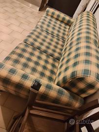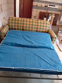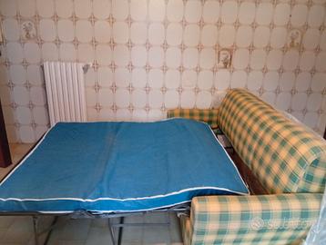 Regalo divano letto con seduta a tre posti, in stoffa, con fantasia a quadri color crema e verde. Lo stato generale è buono. Il materasso è sottile, non adatto a dormirci stabilmente ogni notte, ma utile per ospitare periodicamente amici o parenti. Si trova al secondo piano. Misura circa 190 x 90