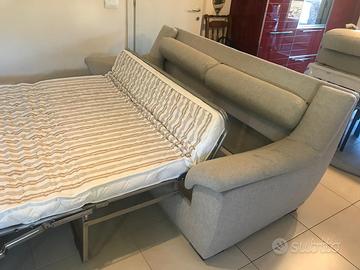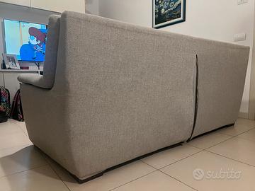 Divano letto color tortora- grigio. Dimensioni 2,10 m x 1 m di profondità x 90 cm altezza. Come si vede dalle foto, si possono togliere i cuscini e diventa un divano letto matrimoniale. Come si vede dalla foto la cerniera sul retro del divano non si chiude più bene. I tessuti sono tutti estraibili e lavabili.