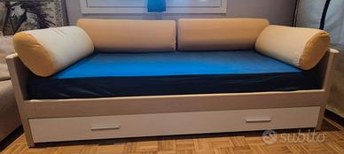 Divano letto a 2 piazze lunghezza 202 cm, profondità 87 cm,con cuscini ornamentali con federa con cerniera , lavabile in lavatrice ,2 reti con doghe in legno,tutto in ottimo stato. Senza materassi.