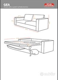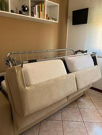 Divano 3 posti convertibile in letto da una piazza e mezza. Tessuto sintetico, color beige. Materasso incluso, sempre protetto con proteggi materasso. Vani per cuscini sotto al divano. Utilizzato 2 volte. Marca Mondo Convenienza.