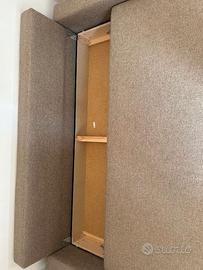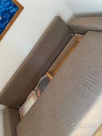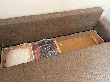 Divano letto color biscotto, una piazza e mezza dotato di 2 contenitori per riporre lenzuola, cuscini....etc. Misure ( modalità letto) 138 x 225 ; modalità divano 225x95.