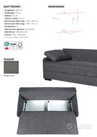 Prodotto nuovo disponibile ritiro in azienda Divano letto Tessuto grigio ( disponibile anche marrone) Dimensioni: 200x95x91 Altezza seduta 46cm Dimensioni letto aperto : 190x140cm Dimensioni letto chiuso : 190x70cm Meccanismo apertura : scorrevole
