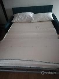 divano letto matrimoniale, usato solo un paio di volte perché poi mia nonna è entrata in casa di riposo, vendiamo comunque come usato, per correttezza. colore e tessuto in perfetto stato, colore molto bello, la foto non rende bene il colore. facile da aprire e chiudere. chiuso, il divano misura 155 di larghezza. il materasso misura 180x120, spessore 15