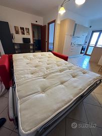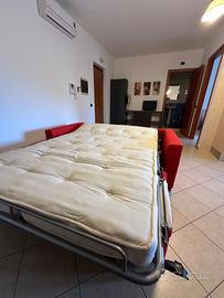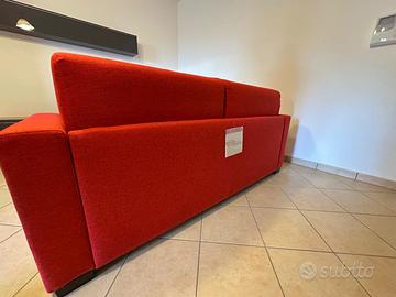 Divano letto matrimoniale in tessuto rosso sfoderabile. Il meccanismo a ribalta trasforma il divano in un letto accogliente in pochi secondi. La rete è elettrosaldata ed è incluso un materasso spesso 10 cm, nella versione matrimoniale alla francese 140x180 cm. Completa il design un vano porta guanciali integrato nello schienale, ideale per riporre cuscini o coperte in modo ordinato. Sullo schienale è ancora presente il cartellino “scheda prodotto”: il divano è stato utilizzato poche settimane l’anno.