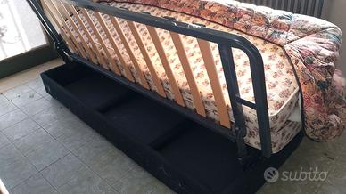 da divano a tre posti - con un solo semplice movimento - si trasforma in un comodo letto - Il meccanismo click clack è realizzato con il lato lungo in orizzontale e con semplicità si trasforma da divano in un letto a una piazza e mezza - Dimensioni Aperto (Letto) 190 x 120 - Il materasso appoggia su doghe in legno - nella parte sotto la seduta c'è un pratico cassonetto contenitore rivestito in tessuto non sfoderabile. Ritiro eventuale SOLO sul posto = Santorso Via Lesina (VI) . Chiedere di Paola 388/5660941