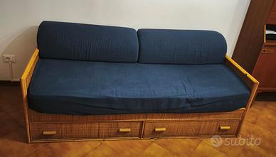 Vendo divano letto vimini con materasso e schienali imbottiti con cassetti. Materasso singolo da una piazza. 197 cm x 90 cm x 64 cm ( L x P x H ) Ritiro in Loco.