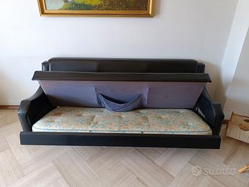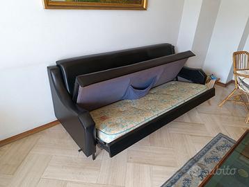 Vendesi splendido divano letto vintage originale degli anni '60/'70, in eccellenti condizioni di conservazione. Un pezzo di carattere ideale per arredamenti in stile modernariato, industriale o per dare un tocco retro a un ambiente contemporaneo. Design: Linee pulite con iconici braccioli sagomati e struttura "slim". Materiale: Rivestimento in similpelle (vinile) nera, integra e senza tagli evidenti mancante di bottoni. Piedini in metallo nero originali. Funzionalità: Meccanismo a ribalta fluido e perfettamente funzionante. Si trasforma in un letto matrimoniale/una piazza e mezza in pochi secondi. Dettaglio unico: Materasso originale con trama floreale d'epoca ben conservata (visibile in foto). Stato: Struttura solida e imbottitura ancora sostenuta. 70% di sconto se ritirato entro la prossima settimana SOLO RITIRO IN LOCO