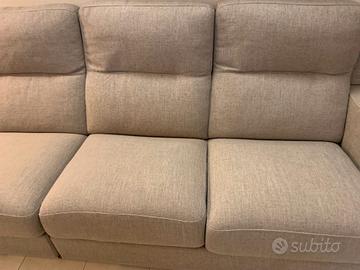 Dimensioni: lunghezza tre metri seduta 57 cm poggiaschiena 65 cm la seduta e il poggia schiena solo attaccati da una cerniera che si può staccare o tenere tutto unito profondità 95 cm il divano si apre a metà Come si vede nelle foto e il ritiro di persona