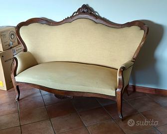 Divano del 1800 in stile luigi Filippo. ritappezzato negli anni 90 e poi non più usato. presenta lieve danneggiamento della tappezzeria nella parte posteriore destra causa graffio gatto