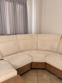 Divano angolare in alcantara bicolore (beige nella parte superiore e marrone nella base), in buone condizioni e ideale per chi cerca spazio, comfort e un look caldo ed elegante. Le sedute sono 7, ben distribuite e perfettamente sfruttabili grazie alla forma a “L” con angolo stondato.
