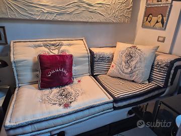 Divano Mah Jong firmato da Jean Paul Gaultier con cuscini abbinati. Divano composto da due cuscini di cui uno angolare con stampa Jean Paul Gaultier e due cuscini da mettere sotto in tessuto blu. In regalo due cuscini firmati. Condizione pari al nuovo, usato pochissimo. Vendo per passaggio a divano letto. Il divano è un pezzo di design di alto livello venduto nella maison francese di Roche Bobois. Prezzo trattabile