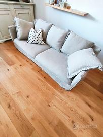 Vendo divano Barcelone di Maison du Monde in lino lavato color corda,3/4 posti, lunghezza 2,07mt alto 70 cm ,comodo,morbido cuscini in piuma,leggermente rovinato su un lato del tessuto ma con possibilità di essere rammendato
