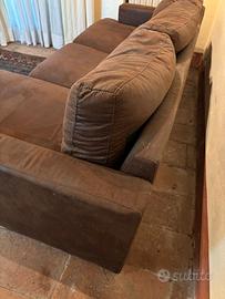 Divano angolare in tessuto scamosciato marrone con chaise longue estraibile a sinistra, misure larghezza cm 210, profondità 90/140, altezza 60 lo schienale, 80 compresi i cuscini.
