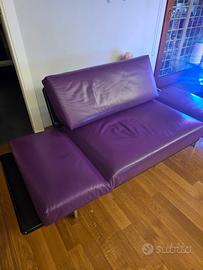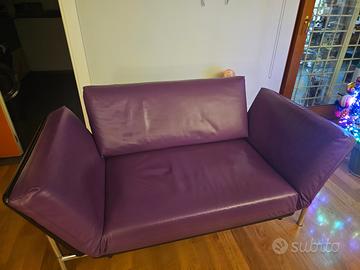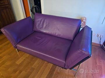 Designer R. Tapinassi - La struttura in acciaio con finitura cromata. La pannellatura realizzata a stampo in poliuretano integrale. Il cuscino seduta e schienale sono in poliuretano espanso. Il rivestimento è in pelle COLORE VIOLA.