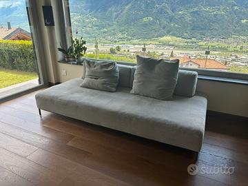 Divano in tessuto grigio sfoderabile, come da foto. Gli schienali si possono spostare e il divano può, per esempio, ospitare persone sedute su entrambi i lati; gli schienali si possono anche posizionare ad angolo per creare un appoggio a 90 gradi. Oltre agli schienali rigidi, sono compresi nel prezzo due schienali/cuscini ulteriori. Il divano ha circa 4 anni. (Prezzo di listino circa 3950 euro)