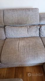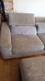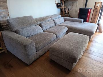 vendo divano in stoffa usato con chaise longue e pouf separato in coordinato di metri lineari 3,18 x 1,05 in profondità, e chaise longue con profondità pari a 2,15 metri. il divano comprato da poltrone&sofà nel 2018 è usato e presenta alcune macchie dovute da pennarelli, causa bambini piccoli. la struttura è perfetta, cosi come tutta la stoffa che lo ricopre non presenta buchi o bruciature di sigarette, vissuto da non fumatori. Alcune ombreggiature presenti su cuscini sono facilmente lavabili con un ciclo di lavatrice. Sono presenti cuscini lombari e poggiatesta regolabili. Il divano si compone di due pezzi separati: la parte di divano e quella della chaise longue. PREZZO TRATTABILE! COSTO DI SPEDIZIONE A CARICO DELL'ACQUIRENTE, CON TRATTABILITA'!