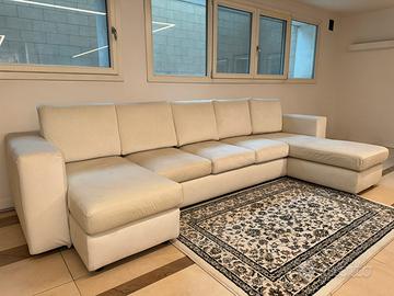 Divano in tessuto idrorepellente simil camoscio, colore bianco, interamente sfoderabile e lavabile. Misura 3.70 mt lunghezza, con 2 chaise longue laterali da 150 cm e da 170 cm.