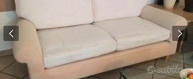 Divano 3 posti a due cuscini in tessuto marrone cinigliato completamente sfoderabile.Struttura robusta in legno, possibilita’ di togliere la gonnella sotto al rivestimento e lasciare i pidi inmlegno chiaro a vista. Corredato da due cuscini e due copribracciolo stesso tessuto.