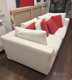 Vendo divano Minotti. Bellissimo e senza tempo. Elegante divano a 3 posti Minotti, con cuscini bianchi e rossi. In buone condizioni generali, usato, con piccolo strappo sul bracciolo (visibile in foto). Divano e cuscini sfoderabili ed un cuscino grande ha il lampo rotto.