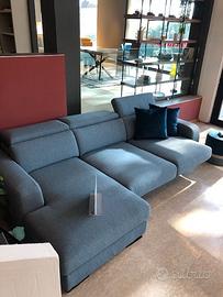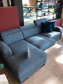 Divano modello Graffiti ditta Le Comfort in tessuto blu con due slide manuali ed una chaise longue, completo di poggiatesta reclinabile. L293xP100/170