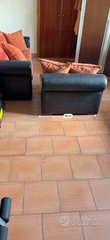 Struttura e braccioli in ecopelle nera, cuscini e sedute in tessuto colore arancio/terracotta con 2 cuscini grandi decorati + cuscini arancio.