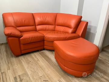 Divano angolare in vera pelle con pouf poggiapiedi mosulabile. Misure: Lunghezza: 195cm Profondità: 93cm Color papaya (arancione). Usato, buone condizioni, altre foto o info disponibili in privato. Prezzo €450 trattabili.