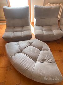 Modello modulare componibile, composto da più elementi (angolo, sedute singole e pouf) che possono essere disposti a piacere per adattarsi a qualsiasi ambiente.